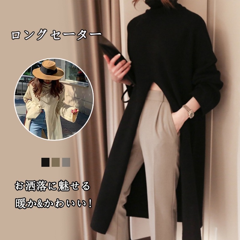 タートルネック 春 ニューデザイン ハイウエスト スリット おしゃれ タートルネック ロング丈 ワンピース セーターラウンドネックニットベーシックニット