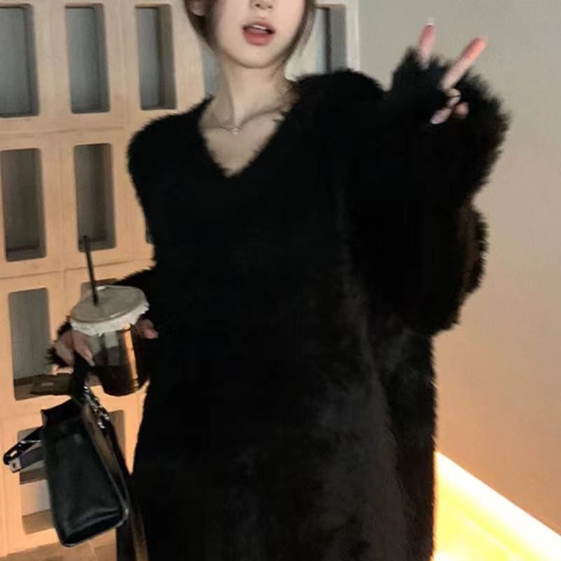 怠惰な黒のソフトVネックモヘアジャンパーの女性の緩いプルオーバー純粋な欲望のニットウェアのシニアの感覚 ニット