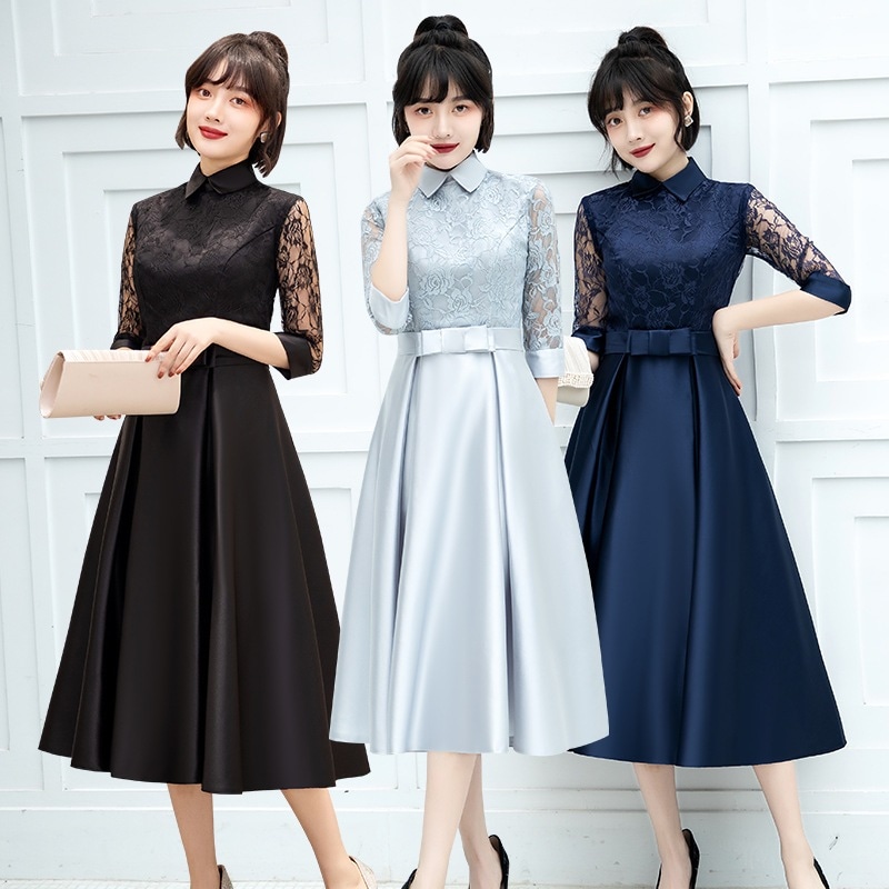 パーティードレスミモレ丈結婚式ワンピースフォーマルドレスグレー結婚式ドレス五分袖お呼ばれ服服大きいサイズ大人上品女性203040 ドレス