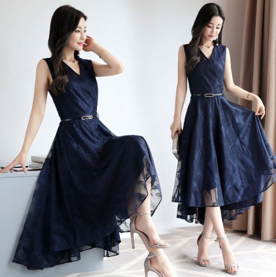パーティードレス ガウン レディース ネイビーブルー ドレス OL 成人式 演奏会 発表会 卒業式 レース ファッション フリル ドレス ドレス気質 ドレス