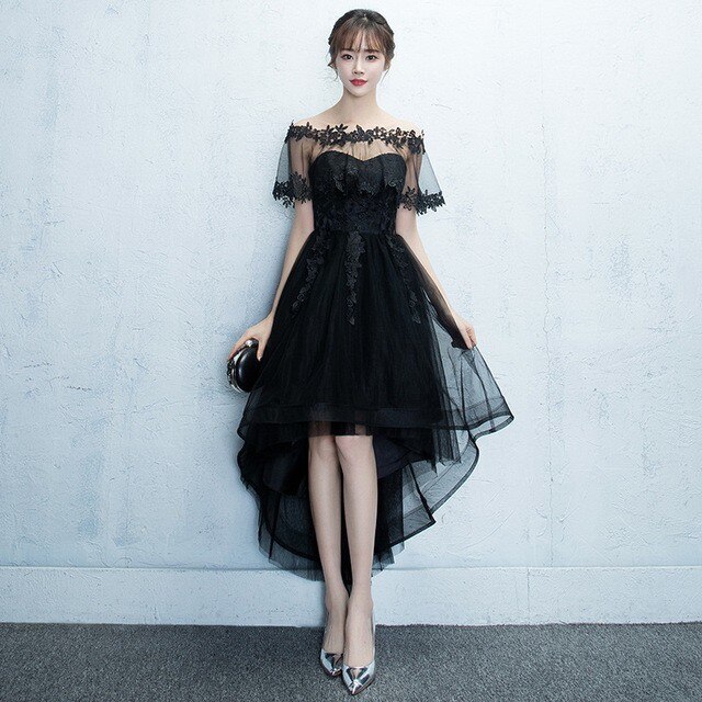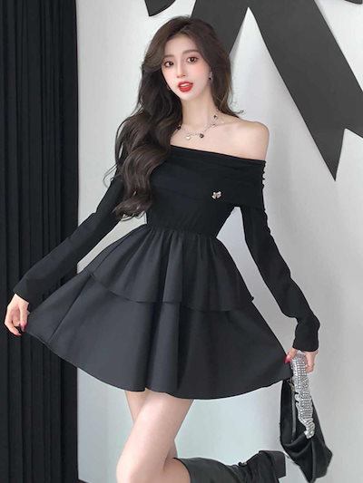 パーティードレス 長袖黒ワンピース春取り入れウエストケーキスカート上品a字スカート肩出しスカート ドレス
