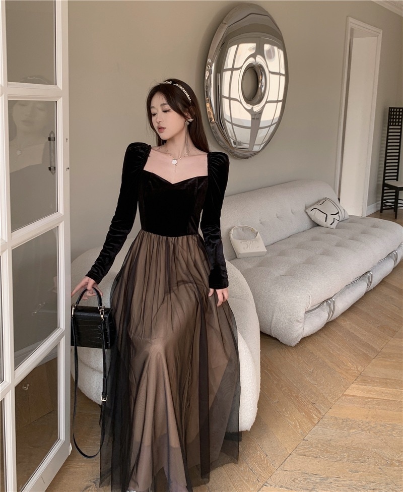 ベロアワンピース レディース ロングワンピ 長袖 春 ワンピース レトロ バルーンスリーブ ドレス マキシ丈ワンピース バーティー 結婚式 宴会