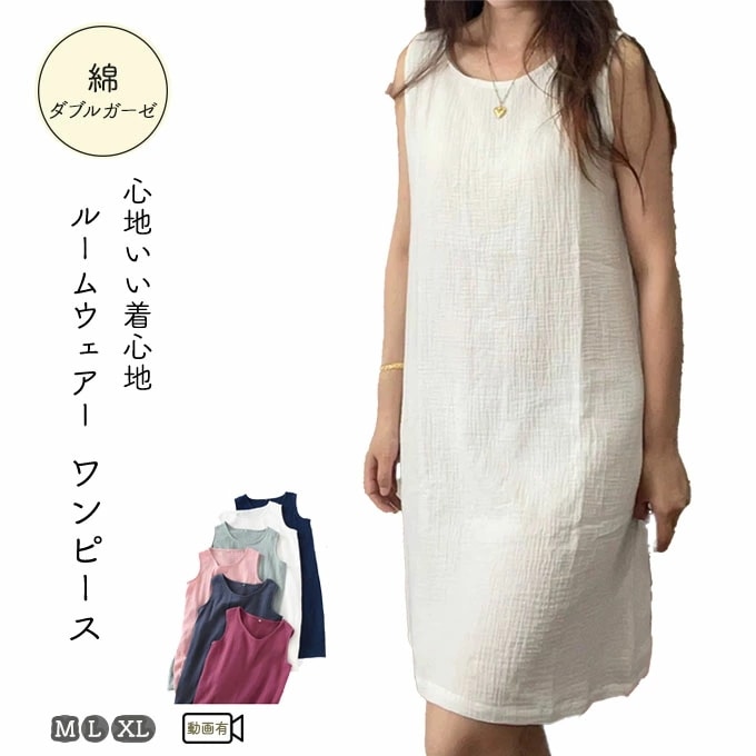 綿 ダブルガーゼ ワンピース 夏 ルームウェアー 部屋着 シンプル Aラインシルエット パジャマ ナィティ 被るだけ レディース 綿 凹凸感 スラブ シワ感 ワンピ 2重ガーゼ ホワイト