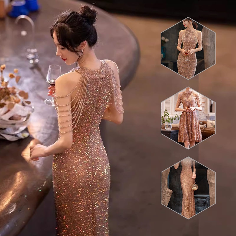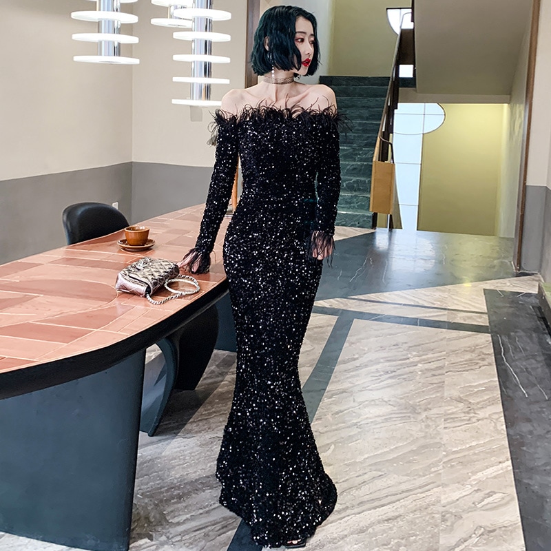 ドレスバンケットスタイルワンショルダードレスブラックスパンコールテールホストシニア ドレス