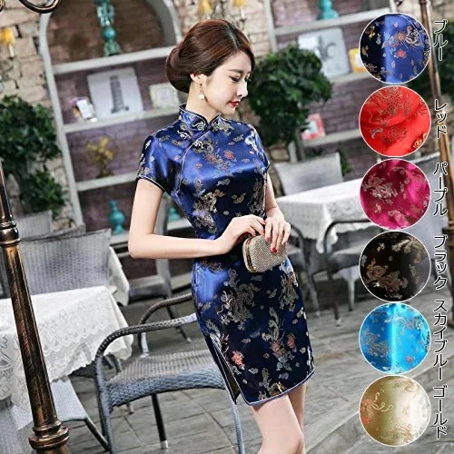 チャイナドレス 龍 鳳凰 半袖 ミニ ブルー レッド パープル ブラック スカイブルー ゴールド S M L XLサイズ チャイナ服 レディース 仮装 パーティー イベント 龍と鳳凰柄 二