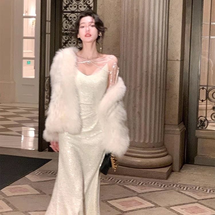 フレンチエレガントレディのスパンコールドレススリムフィットお尻カバーブサスペンダードレス秋 ドレス