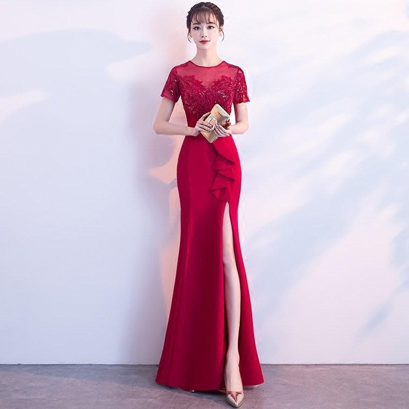 黒のワンショルダードレス宴会気質テールセクシースリムドレス女性用赤い乾杯スーツ ドレス