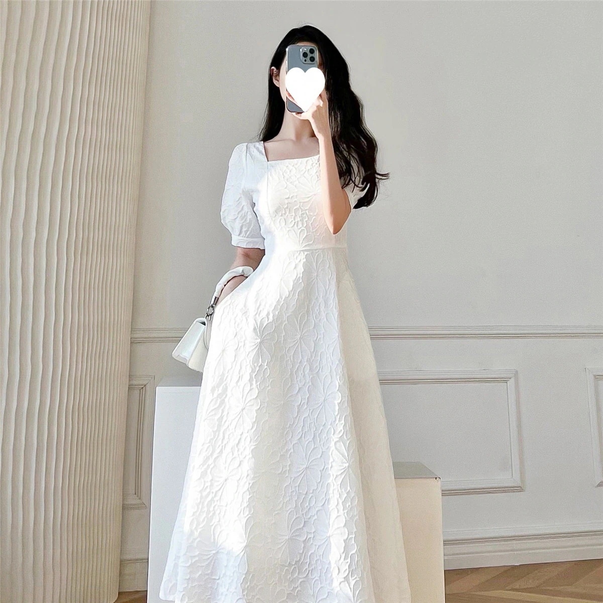 フランス ホワイト ワンピース レディース 夏 スクエアネック 気質 ウエスト引き締め ロングスカート 高級感 スカート ドレス