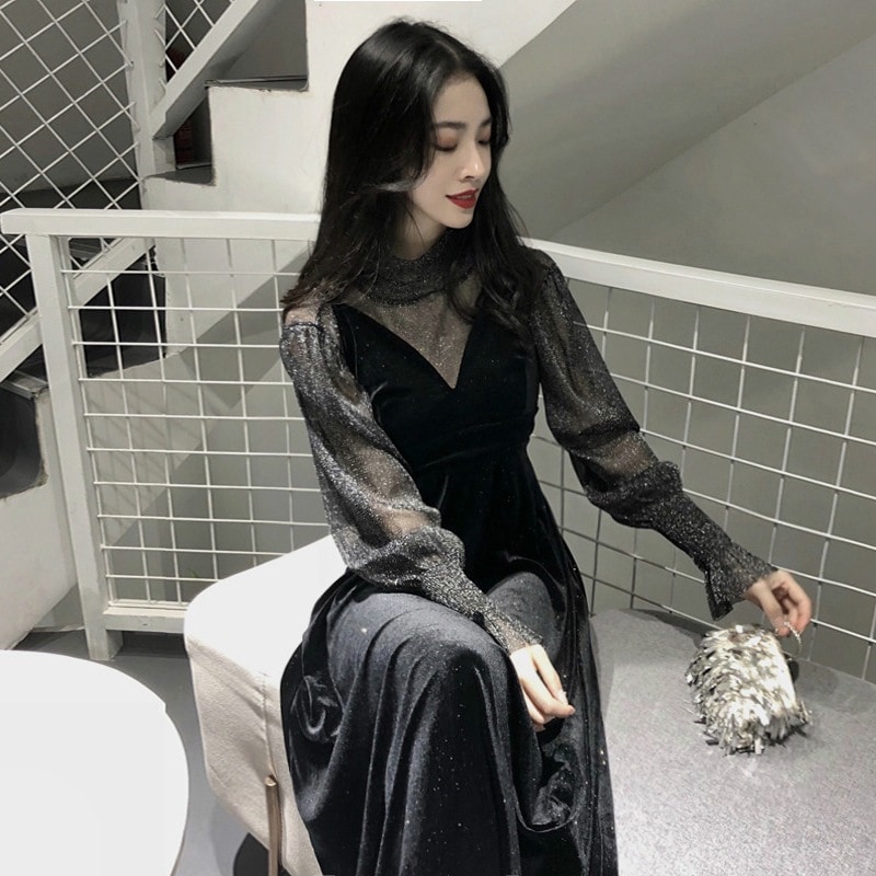 S L1色韓国メッシュパッチワークスパンコールセクシーヒップ包みワンピース ドレス