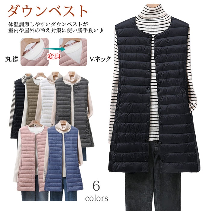 丸襟がボタン一つでVネックに変身 ロングインナーダウンベスト ダウンジャケットレディース 収納ポーチ付き チョッキ ポケット 軽い 体型カバー 暖かい 防寒