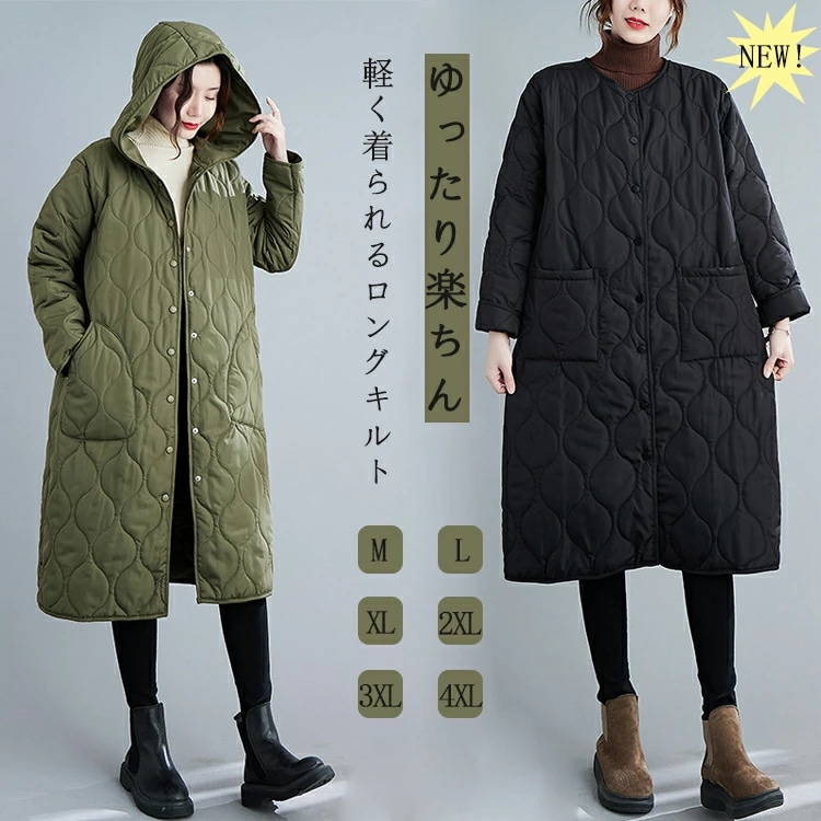 キルティング コート アウター レディース 軽い 暖かい フード付き キルティングコート ロング 女の子 中綿入り 暖か 軽量 防寒 ロングコート 黒 グリーン 大きいサイズ 中綿ジャケット 中綿コ