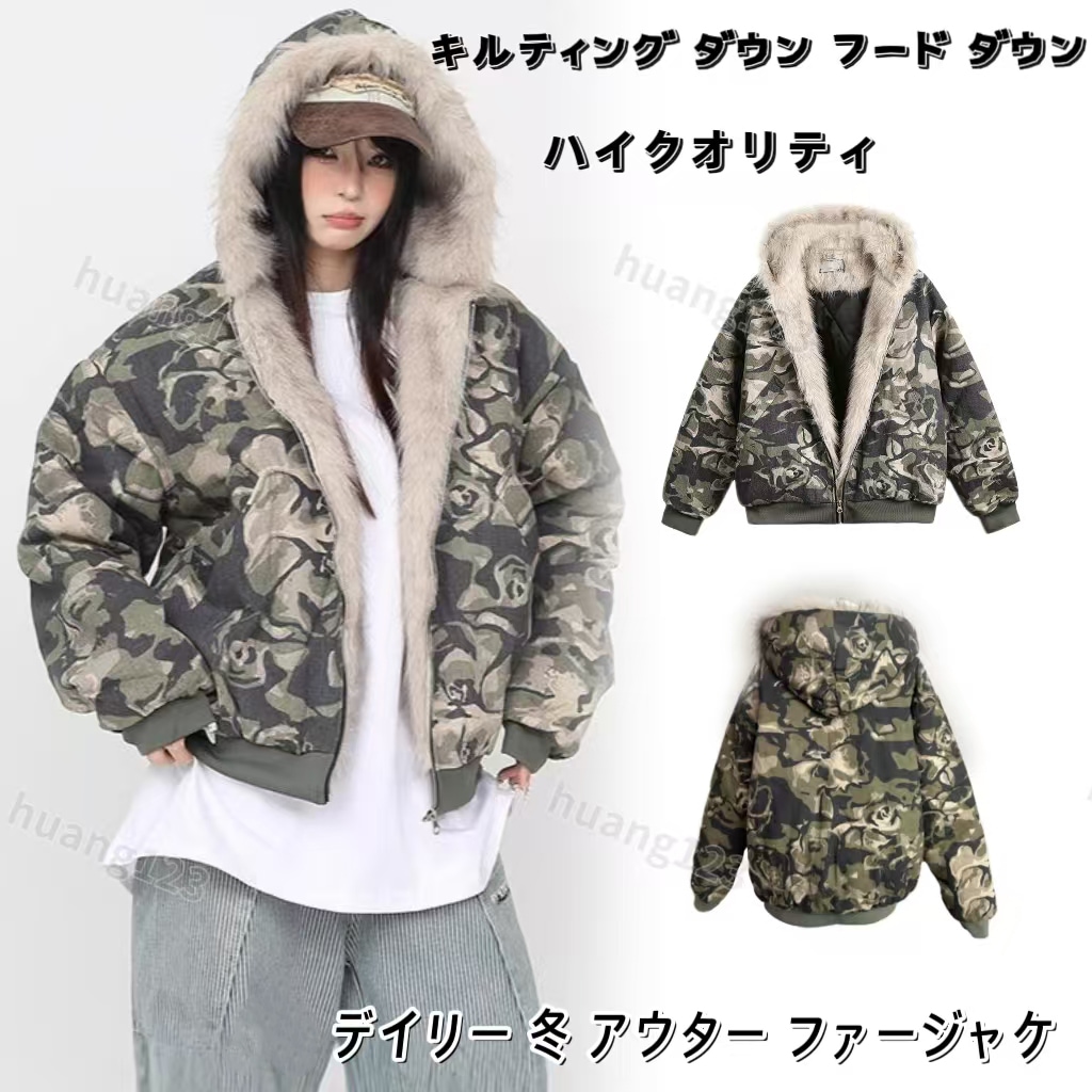 [y2k フィットミーチム ハイクオリティ] カモ ファー キルティング ダウン フード ダウン キルティングダウン オーバーフィット ルーズ y2k デイリー 冬 アウター ファージャケ