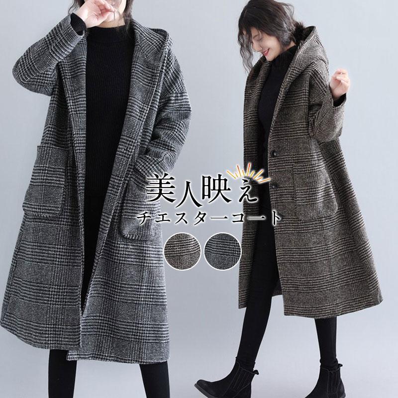 チェスターコート レディース 秋冬 チェック柄 アウター フード ロングコート ジャケット おしゃれ ロング丈 防寒 暖かい ゆったり カジュアル