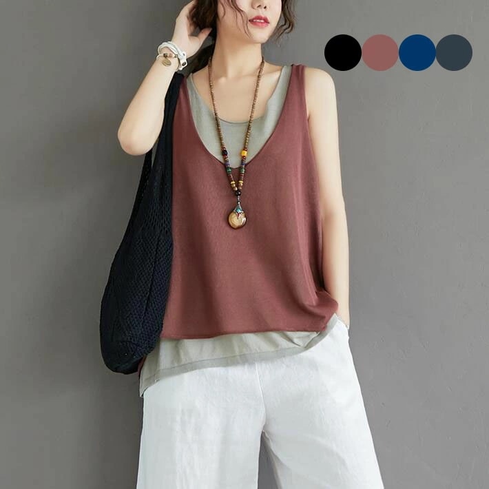 タンクトップ切り替え重ね着キャミソール Uネックレディース シンプル インナー袖なし ノースリーブ通年大きめオーバサイズ キャミソール
