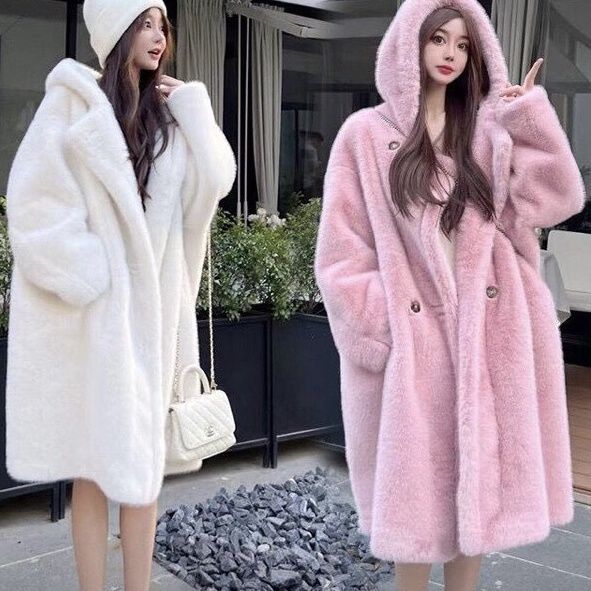 2024 フード付きフォックスファーコート女性用冬ミッドレングスインターネットセレブヤングスタイル織り環境に優しい毛皮の豪華なコート ファー 毛皮アウター