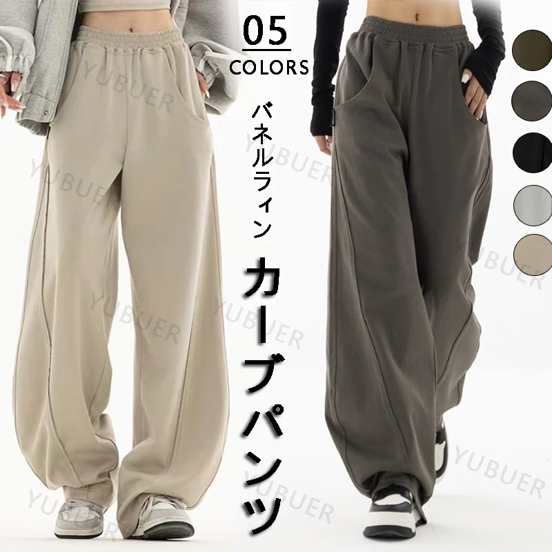 ワイド カーブパンツ レディース パンツ ワイ ドパンツ スウェット ウエストゴム 脚長効果 美脚ライン 秋 冬 ゆったり 体型カバー ジャージ スウェット センターシームコクーン パンツ