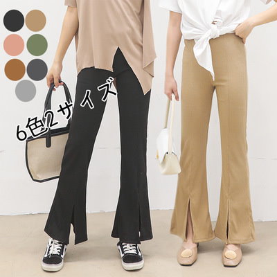春夏新作韓国版7色オプションハイウエストスリムストレッチフロントスリットリブフレアパンツ ロングパンツ