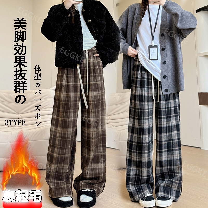 ストレートパンツ レディース ラシャ チェック ボア付き ハイウェスト パンツ 美脚 脚長 ストレート 体型カバー ボトムス ロング ボア 厚手 マキシ丈 ワイド ボト