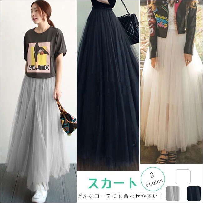ロングスカート チュールスカート 丈が選べる Aライン レディース 女性 ボトムス ロング丈 無地 シンプル ボリューム レース カジュアル 着回し力 合わせ