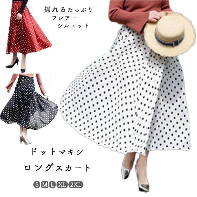 スカート ロング レディース 黒 大きいサイズ フレアスカート ドット 水玉 フレア バルーンスカート ボトムス 厚手 秋 春物 ロングスカート ミモレ丈 シンプル きれ