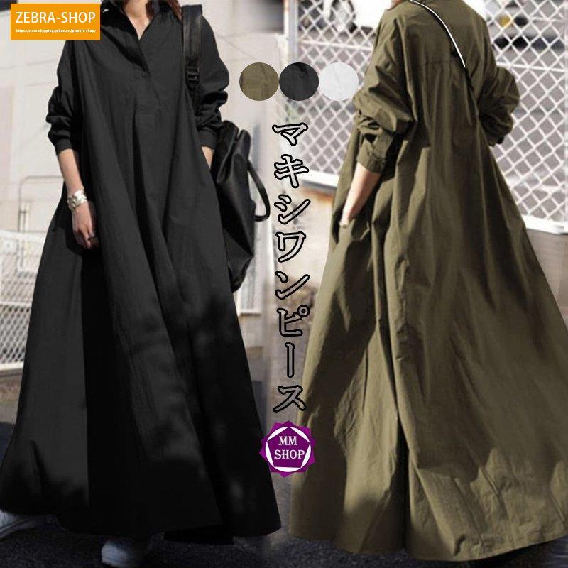 シャツワンピース チュニック マキシ レディース 40代 ロングワンピース 大きいサイズ 秋 長袖 体型カバー 無地 柔らかい フレアワンピース aライン