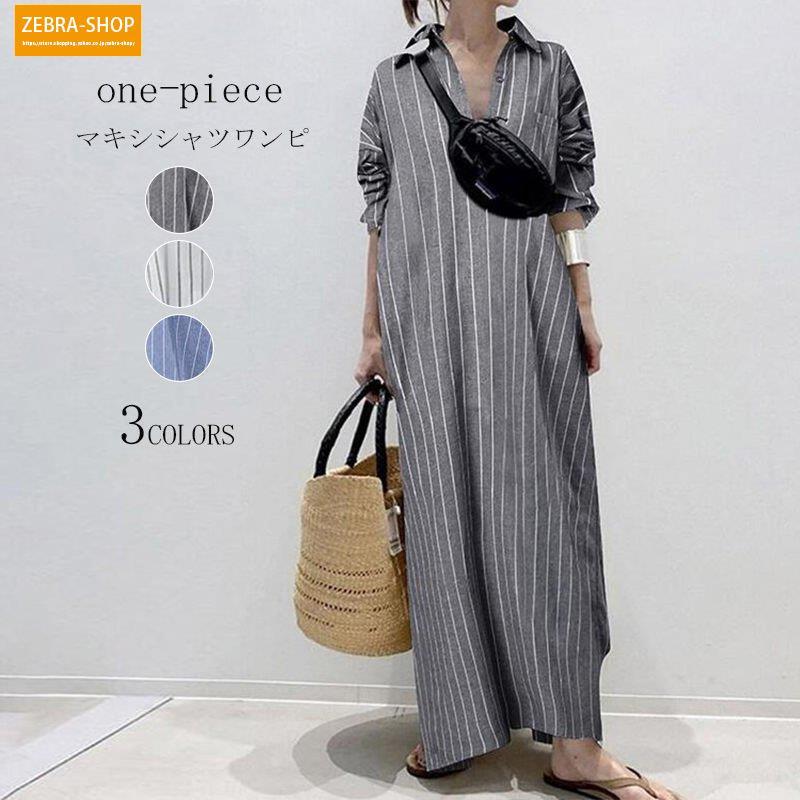 マキシワンピース レディース ロングワンピース 長袖 シャツワンピ 大きいサイズ チュニック ロング丈 ストライプ柄 体型カバー ゆったり ポケット付き 着痩せ