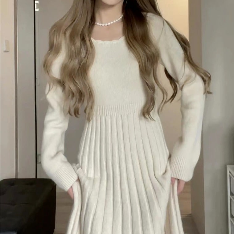 冬のワンピース ロングスカート フレンチワンピース ニットセーター ロングスカート 秋冬 ホワイト 韓国 ファッション レディース その他 ワンピース ドレス