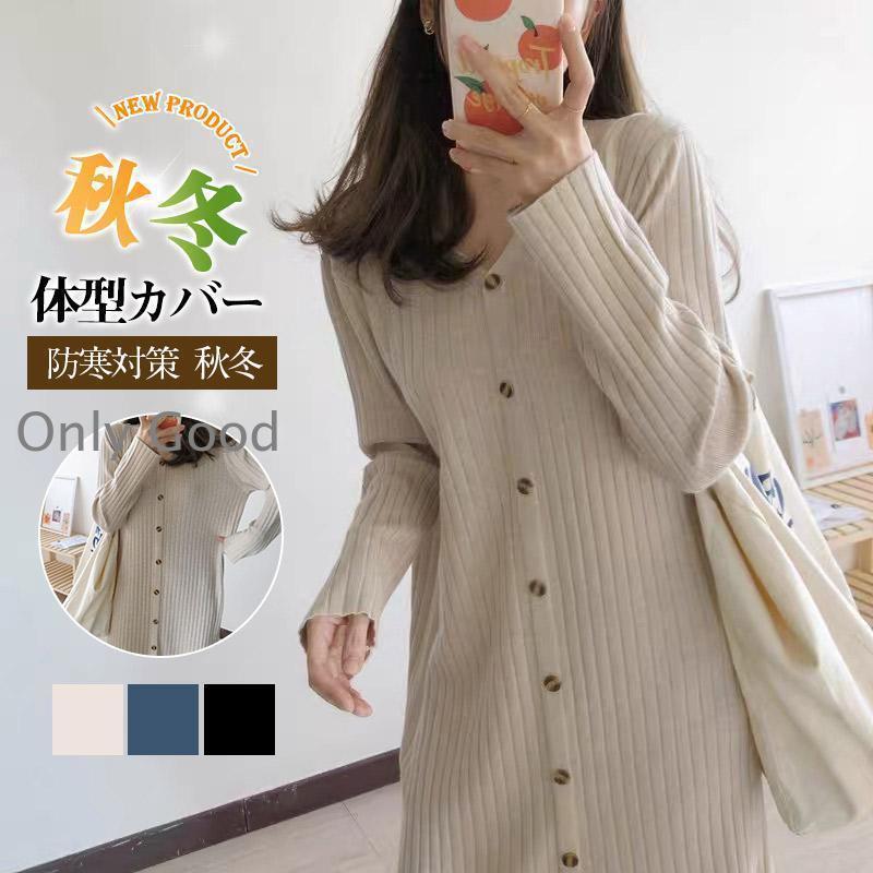 ワンピース レディース 冬 秋 ニット 2way セーター 薄手 ゆったり vネック 長袖 ボタン付き 無地 着やせ 秋冬 ロング 体型カバー