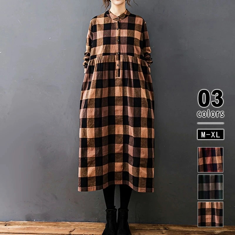 シャツワンピース チェック柄 ロングワンピース シャツ ワンピース 長袖 レディース チェック ロング丈 大きいサイズ 体型カバー ゆったり チェックワンピース