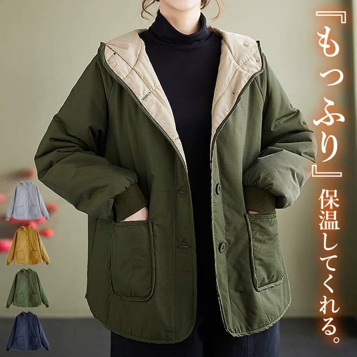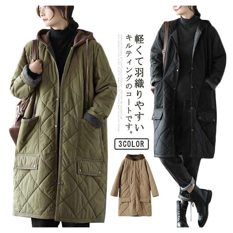 中綿コート レディース 大きいサイズ キルティングコート ロングコート アウター フード付き フロントボタン ポケット付き ゆったり 秋冬 モッズ ミリタリーアウター