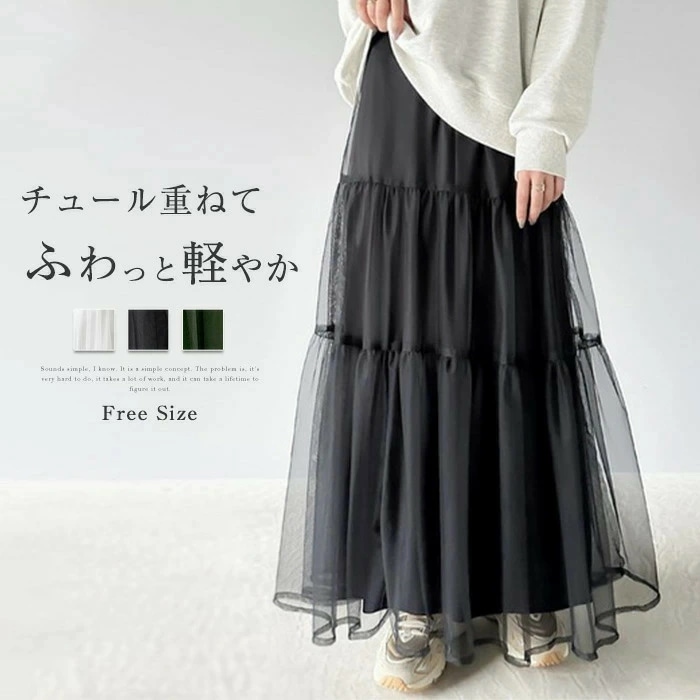 チュールスカート レディース フレア スカート 春 夏 秋 冬 無地 チュールスカート ロング ボリューム Aライン チュール ティアード ボトムス ウエストゴム 体型カバー 可愛い ダンス 衣装 社