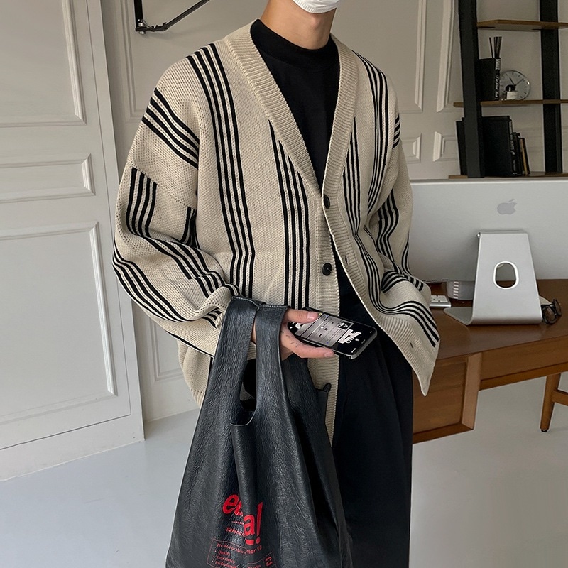 メンズカーディガンジャンパー春と緩いカジュアル風Vネックストライプニットセータージャケット潮の秋の韓国語バージョン ニット セーター