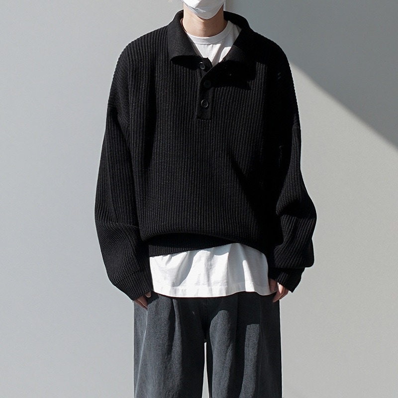 ソリッドカラーのプルオーバーオーバーサイズジャンパーの緩いトレンドのニットポロシャツメンズ秋と冬の韓国語バージョン ニット セーター