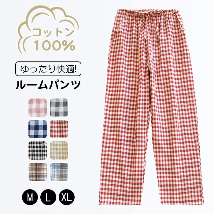 パジャマ パンツ 部屋着 ガーゼ素材 ズボン チェック 男女兼用 イージーパンツ ルームパンツ 綿100 薄手 スウェットパンツ ルームウェア 長パンツ ロングパンツ入院 ペアルック