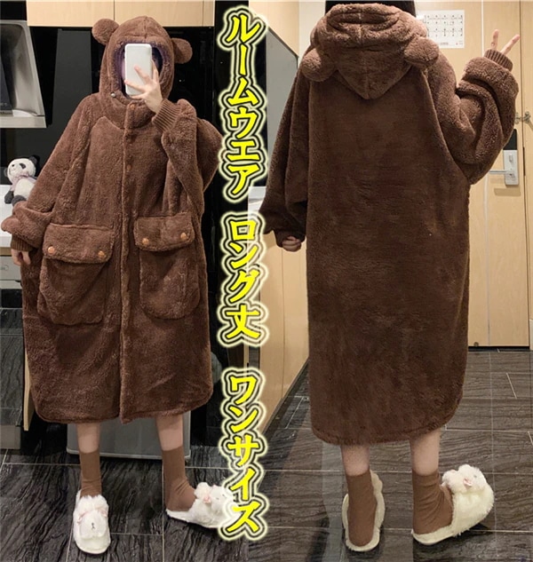 秋冬 レディースパジャマ ファッションルームウェア ネグリジェ ルームウエア ナイトガウン 寝間着 寝衣 長袖 ロング 着る毛布 モコモコ ふわふわ クマ耳 韓国 人気 部屋着 保温 防寒