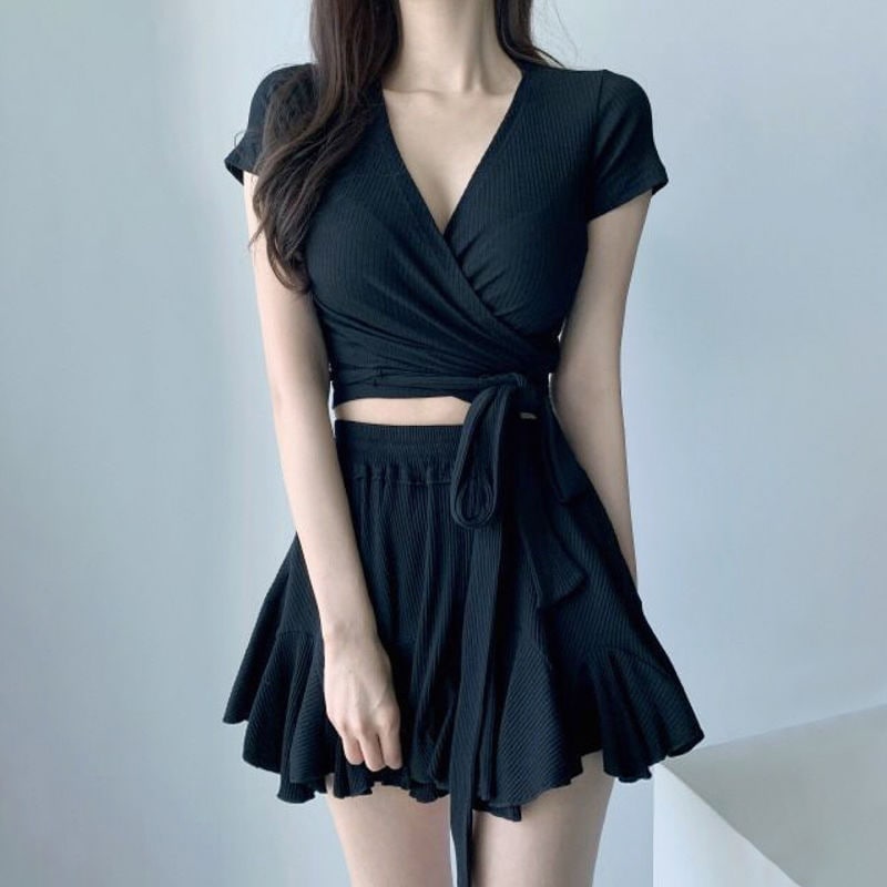 水着 日系 レディース スウィート かわいい 中学生 保守的 2点セット スパ 休日 スプリット スカート スイミング 体型カバー 韓国ファッション