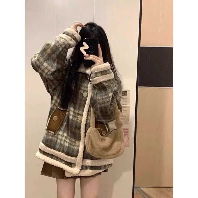 冬 新作 日系 レトロ アウター ジャケット 裏起毛 ラムズフリースアウター チェック ロングジャケット レディース 厚手ラシャアウターラムズウールチェック 流行り