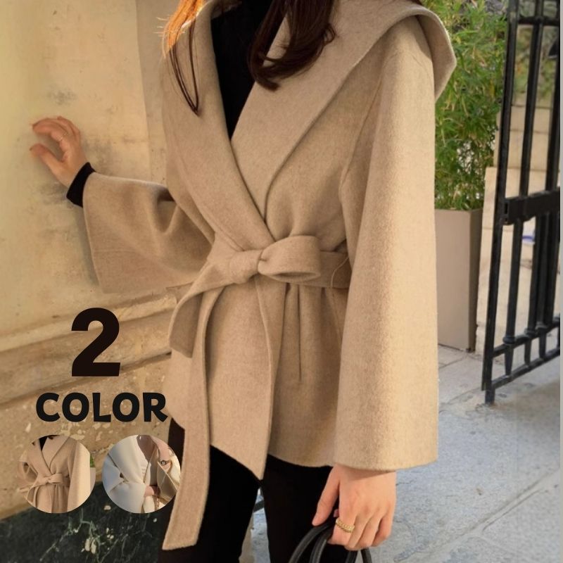 韓国ファッション レディース アウターフーデッドストラップウエストタイショートツイードジャケット トレンチコート