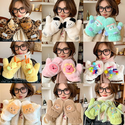 レディース冬韓国スタイル手袋防寒暖かさプラスベルベット厚みのあるハーフフィンガー学生書き込みかわいい漫画ぬいぐるみフリップ手袋 ニット手袋