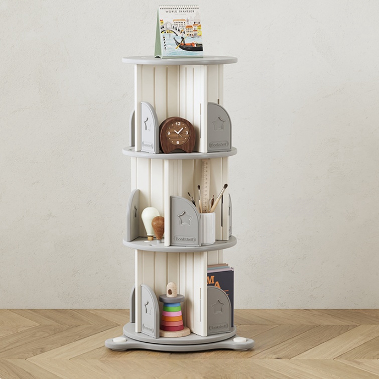 回転式本棚 飾り棚 絵本棚 360°回転本棚 コミック収納棚 本棚 HDPE製 大容量 回転ラック 組立簡単 省スペース 3段 子ども部屋収納 Grey+White Plastic