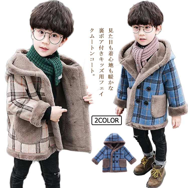 キッズ ダッフルコート ムートンコート 男の子 ボーイズ 厚手 裏ボア Pコート チェック柄 フード付き 長袖 韓国子供服 アウター 防寒 暖かい 子供 厚手コート 裏起毛 冬服 無地 カジュアル フ