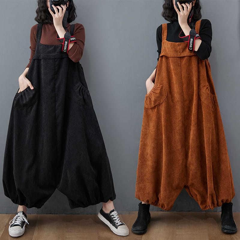ジャンパースカート コーデュロイ レディース ジャンスカ vネック 無地 秋冬 サロペット ロングワンピース 大きいサイズ ノースリーブ ミモレ丈 レイヤード 重ね着 ゆったり カジュアル 体型カバー