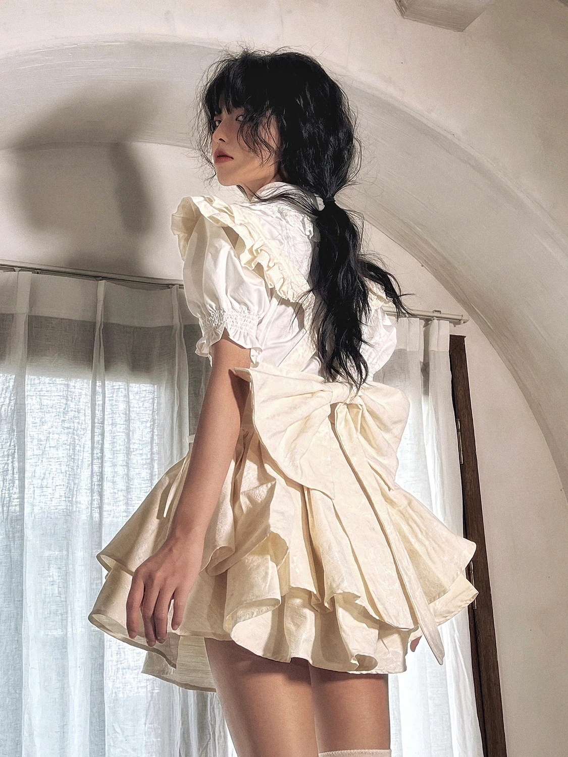 シアースリーブ ドッキングシャツ ボウタイシャツブラウス