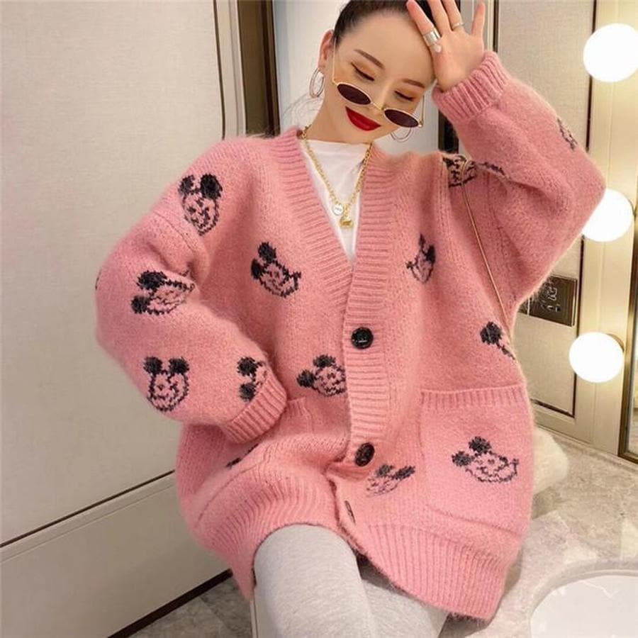 ディズニーミッキーカーディガンニットバッグレディース韓国ファッション秋冬ボーダーニットトップスコート長袖上着ブラウストップス カーディガン